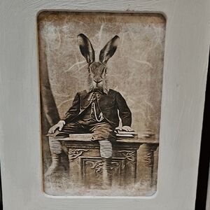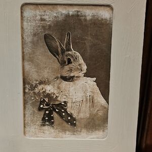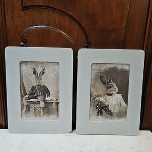 Whimsical chippy rustic grey rabbit portraits with wood frames Perfect for a wedding or anniversary gift