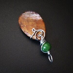 Materials Used: green Jasper Bead, brown Landscape Jasper teardrop, antique silver wire wrapped bail for a medium thick chain or leather cord. This is a nice size pendant but not too heavy. Need a chain or leather cord to go with it? Ask me for options available...