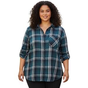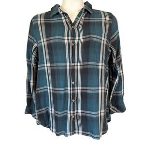 Teal, white, and black plaid, cotton/rayon blend, button down shirt, collared, chest pocket, shirt tail hem, long sleeve with buttoned cuffs, boyfriend shirt, soft, breathable, machine wash