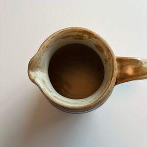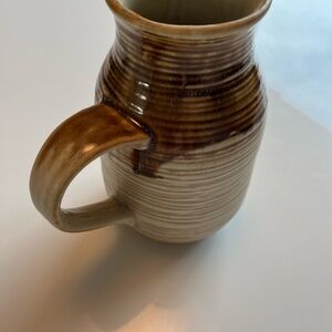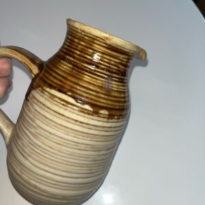Enhance your home decor with this rustic brown ceramic pitcher. Its earthy tones add warmth and charm to any space. Any marks, paint drips and what might look like imperfections are due to the fact it is handmade. Dishwasher and microwave safe.