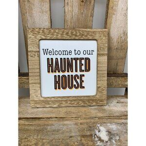 Rustic Haunted House Welcome Sign 4in Square Halloween Decor Tiered Tray Holiday