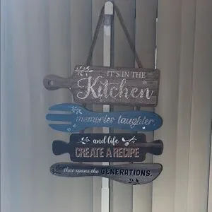 Charming wall decor with a rustic kitchen theme. Features phrases in white, blue, and orange on a wooden background.