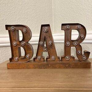 Illuminate your space with this rustic light-up BAR sign. Perfect for a “man cave”, bar top or entertaining area! 14” x 6.5” x 2.5”. Battery powered.