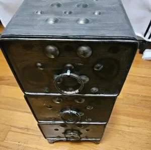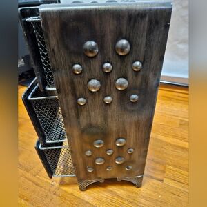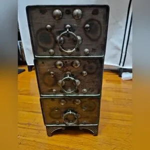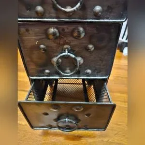 Rustic metal drawer set featuring metal accents and ring handles. Perfect for adding a vintage touch to any room.