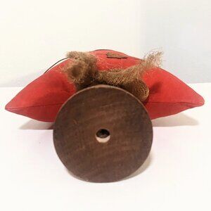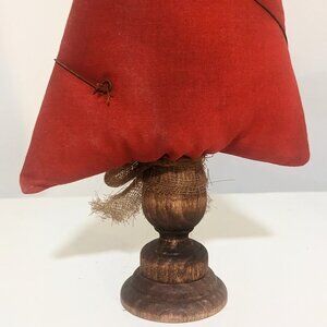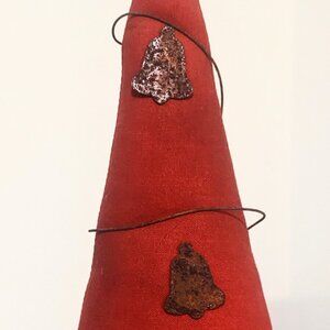 Made out of red fabric with a brown wire garland, metal bell silhouettes, and a burlap bow around the base.