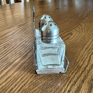 Add a touch of rustic charm to your dining table with the Rustic Moose Metal salt & pepper shaker holder with mini square glass s&p shakers. Moose-shaped metal holder features square glass shakers with metal screw on tops. Holder is approx. 2.5" long x 1.375" deep x 2.5" tall. Shakers are approx. 1" square x 2.25" high each.