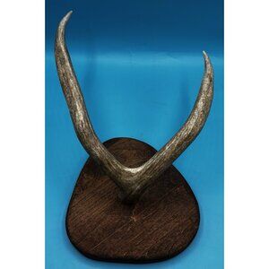 Enhance your cabin decor with this rustic mounted deer antler display. Handcrafted and elegantly set on a wood base, it adds a touch of nature's beauty to any space. Perfect for rustic, cabin-themed interiors.