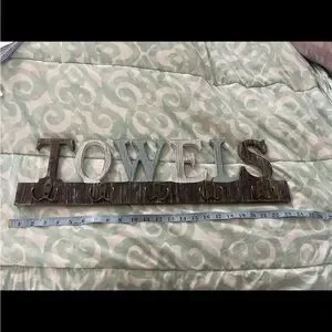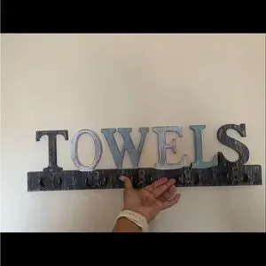 Bought this from Way fair and never used it. Dainty towel holder and would like nice in a smaller / guest bathroom. Hooks are not that large. It’s a cute decoration . Colors are ivory , grey and blue hues