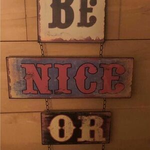 Add charm to your space with this rustic wall sign featuring the phrase 'Be Nice or Leave.' The multicolor design includes shades of blue, red, and black, perfect for any home decor. As seen on Guy Fieri’s “ diners, drive-ins, and dives”