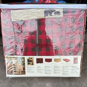 Enhance your home with this charming rustic wildlife patchwork quilt. Featuring a delightful mix of red, brown, and cream colors, this quilt adds a cozy touch to any room. Perfect for nature lovers, it showcases moose and bear designs.