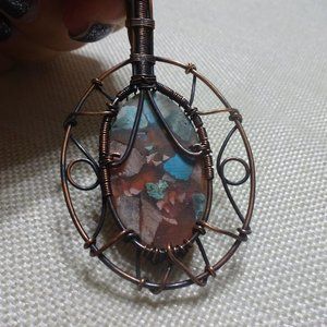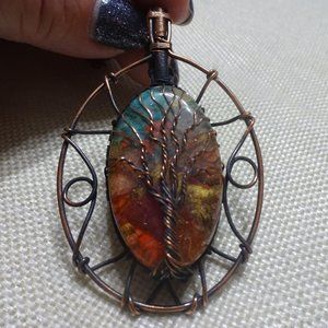 Rustic "OYSTER TURQUOISE" WIRE-WRAPPED TREE Handmade Copper Pendant/Chain #479B