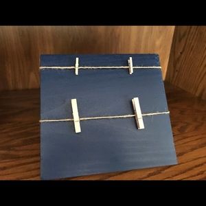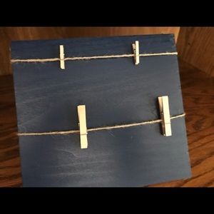 Wood Picture Frame that can hold multi size pictures. Frame is 8in x 8in, navy blue and have mini clothespins to hold pictures.