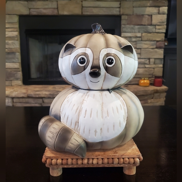 Rustic Forest Friends Pumpkin Racoon. Brand new with tags. Resin material. Measures approximately 11x9.5". Perfect addition to any fall or Thanksgiving decorating.