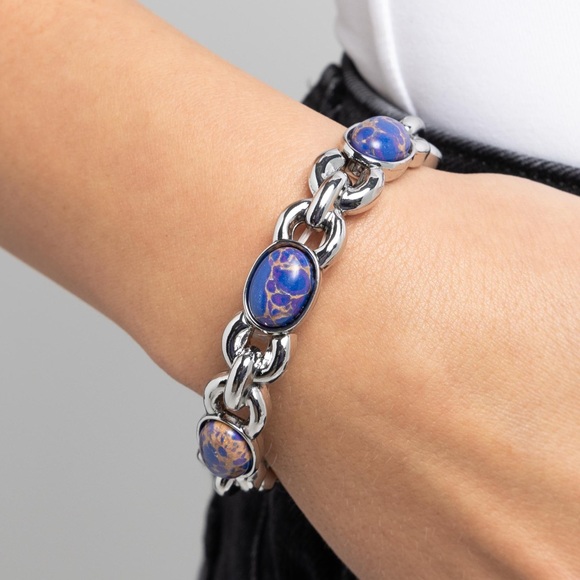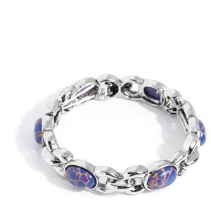 Infused along elastic stretchy bands, a burnished, thick silver chain is sporadically dotted with blue and purple mixed oval stones for a radiantly rustic display. As the stone elements in this piece are natural, some color variation is normal.