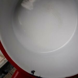 Vintage Rustic Red and White Enamelware Sauce Pan with Handle. Several chips.