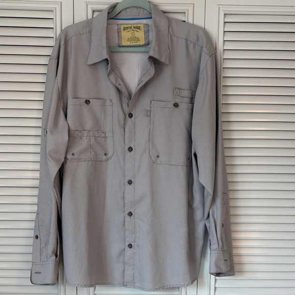 Rustic Ridge long-sleeve, button-down performance shirt. This brand is known for outdoor gear and apparel, with similar shirts featuring vented designs for activities like fishing, camping, and hiking.