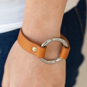 Infused with pieces of shiny yellow leather, an oversized silver ring is studded in place atop the center of the wrist for a rustic flair. Features an adjustable snap closure.