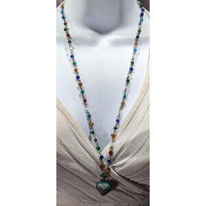 This stunning rustic romantic necklace features a vibrant rainbow of glass beads and a distressed puffed heart pendant, perfect for adding a touch of bohemian charm to any outfit. Ideal for everyday wear or special occasions.