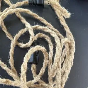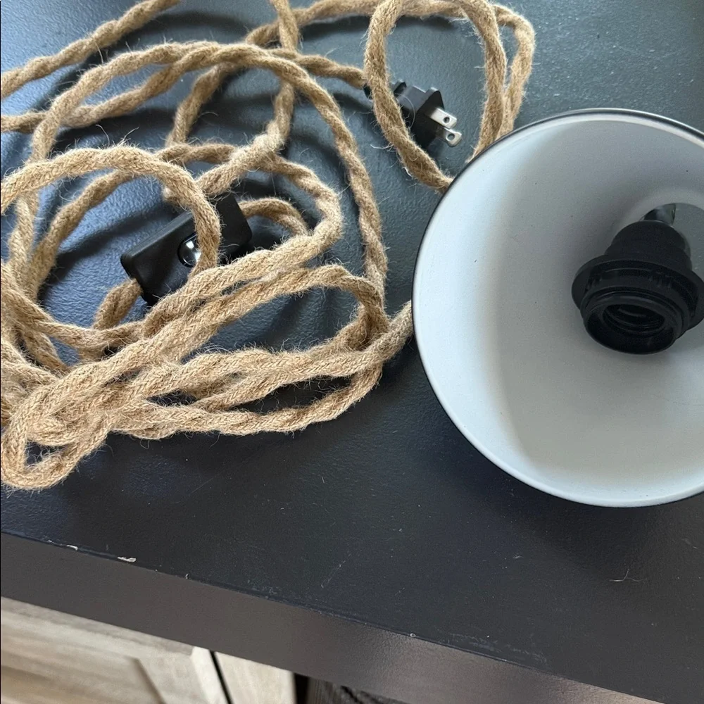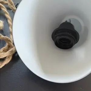 Stylish pendant light with a rustic rope design. Features a black socket and white interior shade.