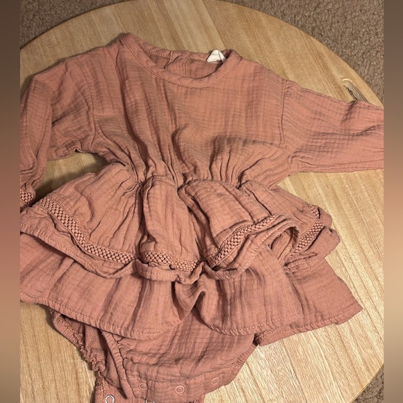 Adorable rustic ruffled baby romper. Features a charming design with textured fabric.