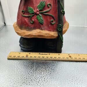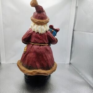 Charming resin Santa figurine holding a blue gift and walking stick. Painted in rich traditional holiday tones with a hand-carved wood-style look. Perfect accent for your Christmas mantle, entryway, or festive display.