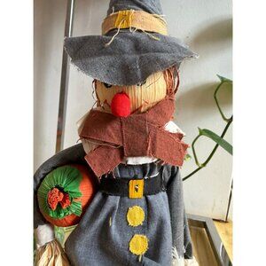 Charming handmade scarecrow figurine dressed in rustic fabric clothing with straw accents and a floppy hat. It holds a small pumpkin and sack, standing on a wooden base — a perfect piece for fall or farmhouse-style décor.