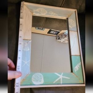 Rustic seashell mirror. Looks and sits like a picture frame. Light blue, white and aqua wood. Approximately 9 1/2 inches by 12 inches. In really good condition.