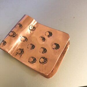Thank you for looking at this handmade copper money clip. New copper finished for a rustic effect. Hand stamped with skulls 24 grams 2x 1.25" Handmade and imperfectly perfect