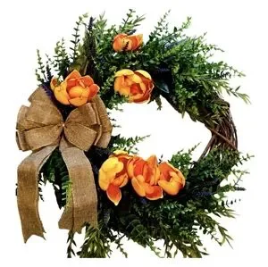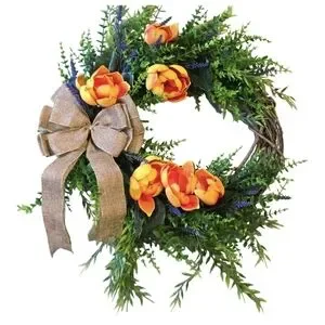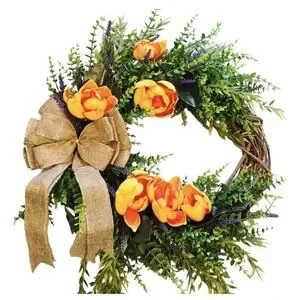 The Rustic Farmhouse Spring Floral Wreath by taralynnboutik is a beautiful and charming addition to your home decor. This artificial wreath features a mix of eucalyptus, lavender, and bright orange magnolia blooms, perfect for adding a touch of spring to your space. Measuring 18 inches in size, this multicolor wreath is ideal for decorating your front door or any room in your home, bringing a cozy and floral theme to your living space. Made with mixed materials in the United States, this wreath captures the essence of a rustic farmhouse spring.