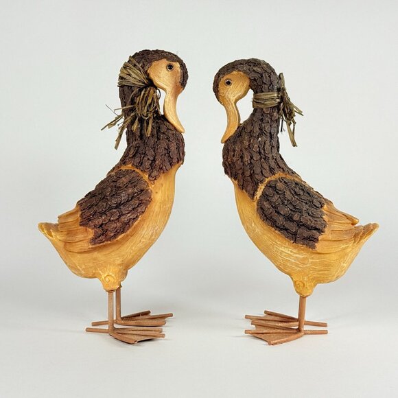 Rustic Style 2 Wood Duck Handcrafted Decor With Bark Like Texture Metal Feet