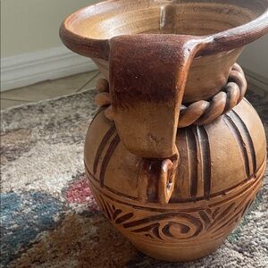 Add a rustic charm to your home with this beautifully crafted tan ceramic pitcher. Its unique design and earthy tones make it a perfect centerpiece.