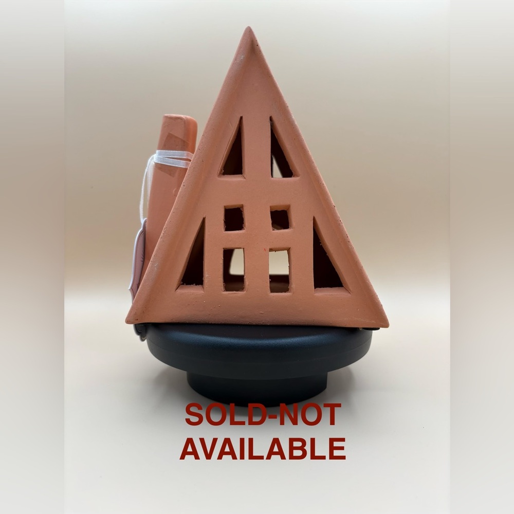 Add a touch of rustic elegance to your home with this terracotta triangle lantern. Its warm color creates a cozy atmosphere, perfect for any room.