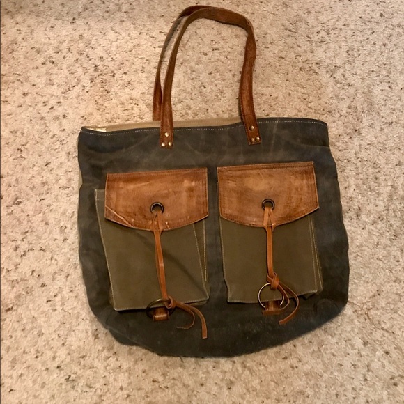 Factory-weathered, rustic tote! Works very well as a quick go-to travel bag or as a work bag as it is large enough to hold a laptop and more!