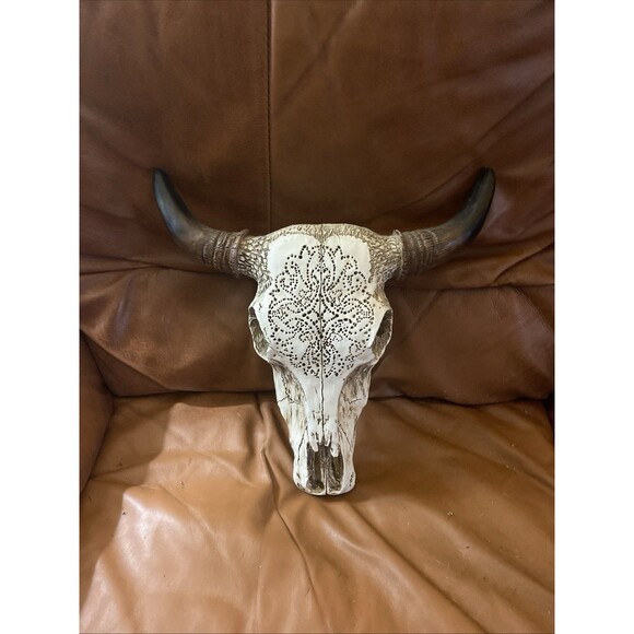 The Boho Rustic Tribal Bull Head Wall Art by BestGiftEver is a beautifully crafted sculpture of a white bull skull, perfect for adding a unique and artistic touch to any home decor. Made from poly resin with a matte paint finish, this wall-mounted piece stands at 14 inches tall and 12.5 inches wide, weighing 2.3 pounds with a depth of 3.5 in. Its rustic tribal design complements a variety of styles and adds a touch of boho character to any room with its bull-themed subject.