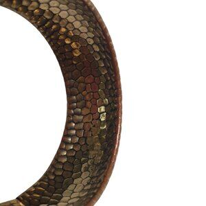 A distinctive vintage-inspired hammered copper bracelet featuring a wide band design and hinged closure. Its textured metal surface adds character and charm for a unique, tasteful look.