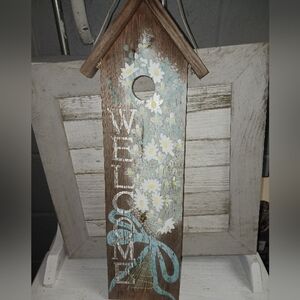 Charming wooden birdhouse sign with 'Welcome' text. Features white daisies and a blue ribbon design.