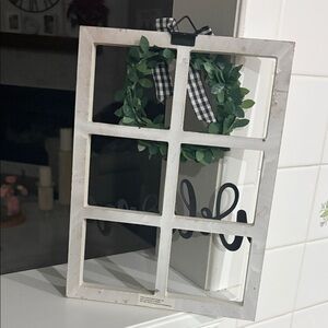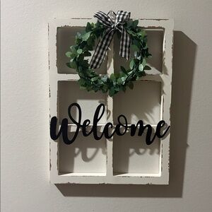 Charming rustic window frame with a 'Welcome' sign. Features a green leaf wreath and black and white checkered ribbon.