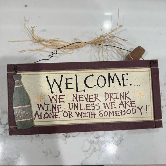 Charming wooden sign with a wine theme. Perfect for home decor. Features a bottle, cork and funny welcoming message.