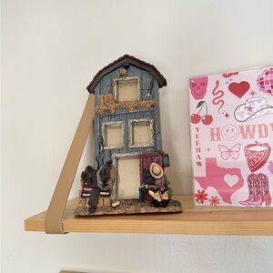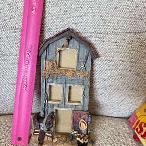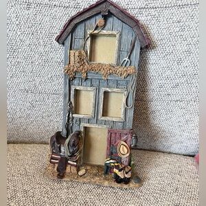 Decorative western-themed multi-photo frame. Features a weathered gray barn façade with hay detail. Includes saddle and cowboy accessories in brown and muted reds. Rustic farmhouse accent for a country home. Fits multiple small photos. Ready to display.