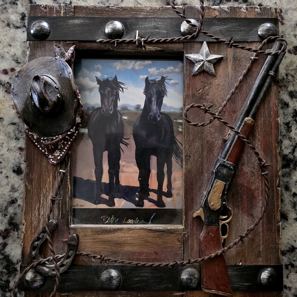 Embrace the spirit of the Wild West with this rustic picture frame featuring a cowboy hat, horses, and a rifle. Perfect for adding a touch of adventure to your home decor.