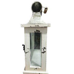 Charming rustic lantern featuring a white distressed finish, metal top with wood handle, and glass panels. Ideal for candles or decorative purposes.