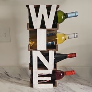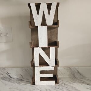 Wooden wine rack with bold white letters spelling 'WINE'. Perfect for a rustic decor.