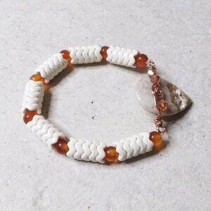 >>> This is an elastic stretch bracelet and will wear like a soft bangle bracelet! The beaded, elastic section of this unique bracelet was created with neutral off-white Howlite Crinkle Beads and genuine, orange hued Agate Beads. Will comfortably fit a 6-6.75" wrist.