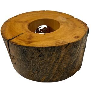Handmade rustic candle holder with carved motorcycle silhouette in resin. Made in the USA by The Scented Candle (Colorado Springs). Natural cracks in the wood enhance its rugged, vintage appeal. Approx. 6” x 3”.