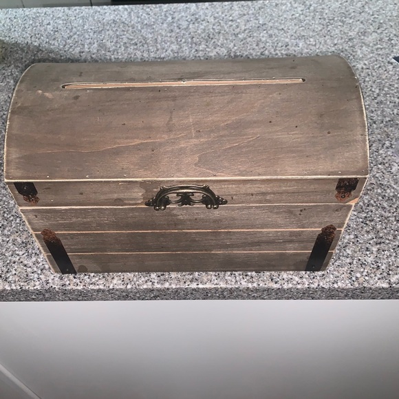 Charming rustic wooden card box with metal accents. Perfect for storage or decor.