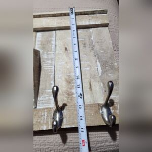 Rustic wooden wall rack featuring four metal hooks. Perfect for organizing coats or accessories.