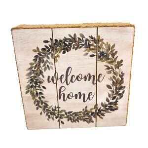This charming square wooden sign features a leaf wreath and "Welcome Home" text. Its rustic design, burlap edges, and compact size make it ideal for accentuating entryways or small spaces. Free standing or hang.