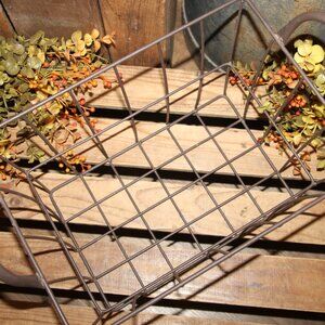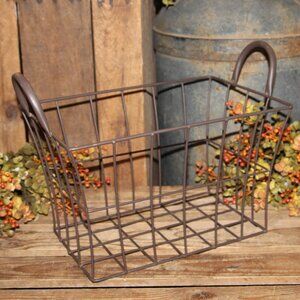 Adorable 8" tall at sides x 10.25" tall to tip of handles x 13" wide x 9.25" deep wrought iron basket with rustic finish. Rectangular basket perfect for filling with seasonal goodies for year round use! Awesome for vintage inspired, French Country or farmhouse decor/storage!