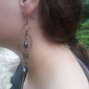 Antique brass circle chandelier earrings with tear dropped smokey glass beads dangling from top center. 3 Small oval antique brass jump rings dangle from bottom of circle. Large, round brass jumprings hang 3 smokey glass beads at the bottom. . 4" length and stainless steel earwires