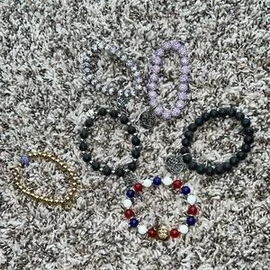 Lots of 6 rustic cuffs. 2 black three purple and one red white and blue